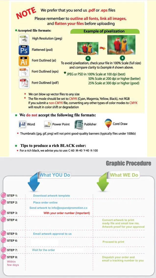 Due to the nature of Large Format Banner Printing, high resolution, high quality artwork files are required: AI(Illustrator) .PDF, .eps format artworks files are recommended,Please remember to outline all fonts,link all images and flatten your files before uploading !