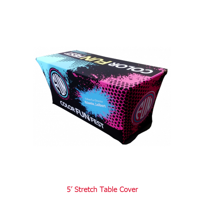 This table skirt, also known as a tablecloth, is printed using a full-color dye-sublimation procedure.